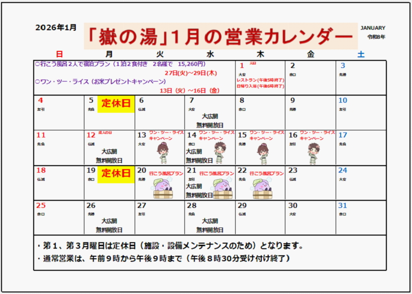 12月31日(水) 日帰り入浴 18:00終了 レストラン 17:00終了 1月 1日(木) 日帰り入浴 18:00終了 レストラン 17:00終了 1月 2日(金)~ 通常営業いたします。 1月 5日(月) 定休日 ■設備メンテナンスのため休業日、営業時間が変更になる場合がございます。